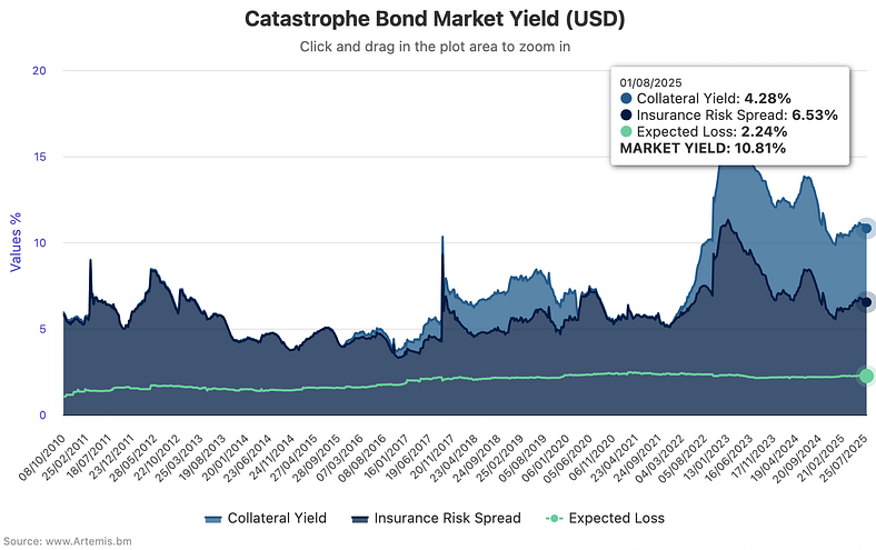 Catastrophe bond market yields had ended June 2025 at 11.03%, after a slight decline towards the end of that month.