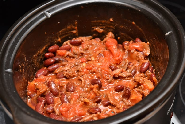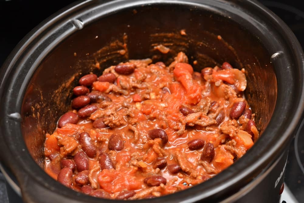 - In a 3 1/2- to 4-quart slow cooker, mix Worcestershire sauce, chopped onion, minced garlic, diced tomatoes, tomato sauce, chili powder, ground cumin, dried oregano, ground cinnamon, and ground cayenne pepper.