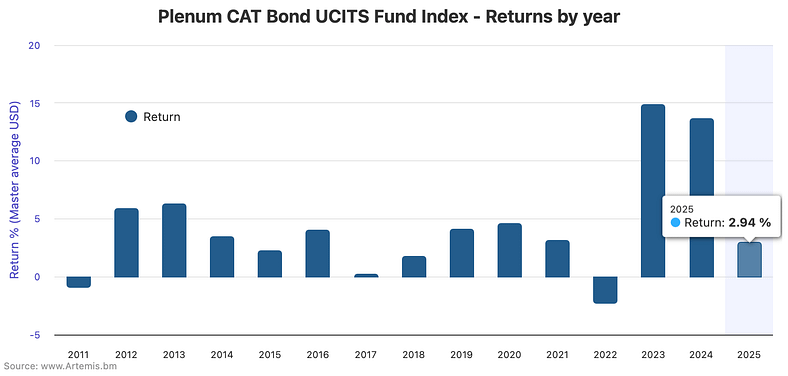 Remember that, 2025 started with UCITS cat bond funds averaging a 0.40% return for the month of January on the initial effects of the wildfires in California, after which performance dropped to 0.32% return for the month of February, as some cat bond positions’ wildfire related mark-downs accelerated during that month.