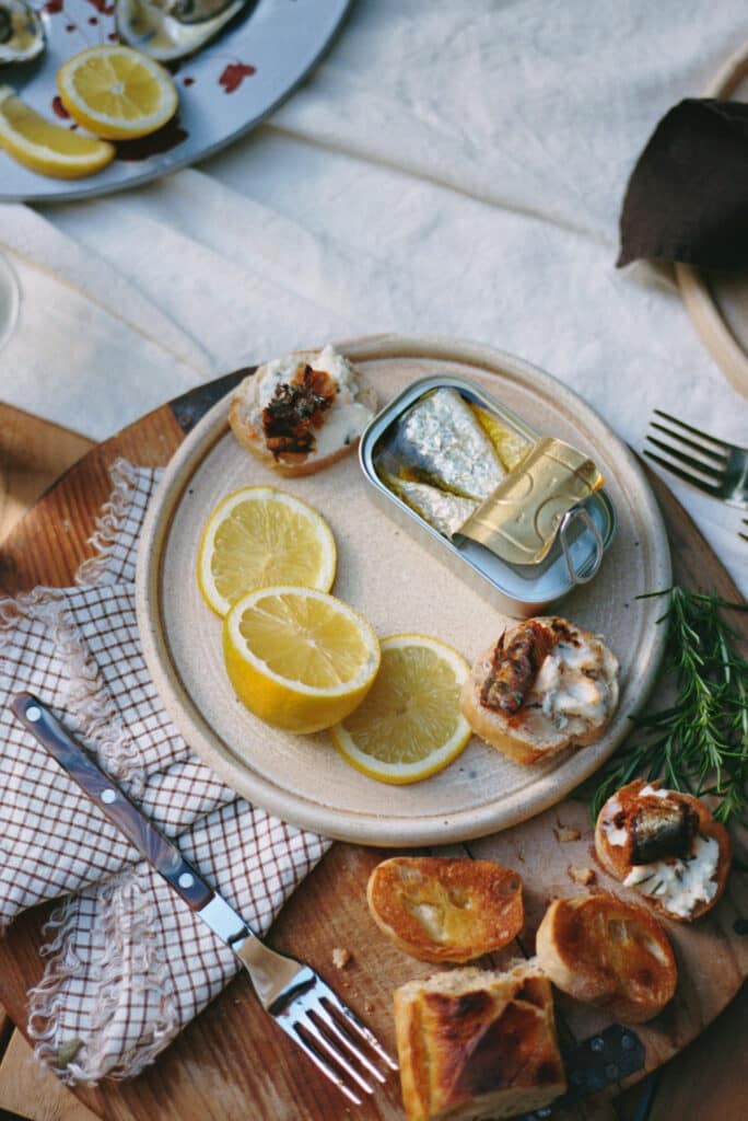 Spread 1 to 2 tablespoons of butter onto each crostini. Top with tinned fish, a drizzle of olive oil, a squeeze of lemon, and sprinkle with flaky salt.
