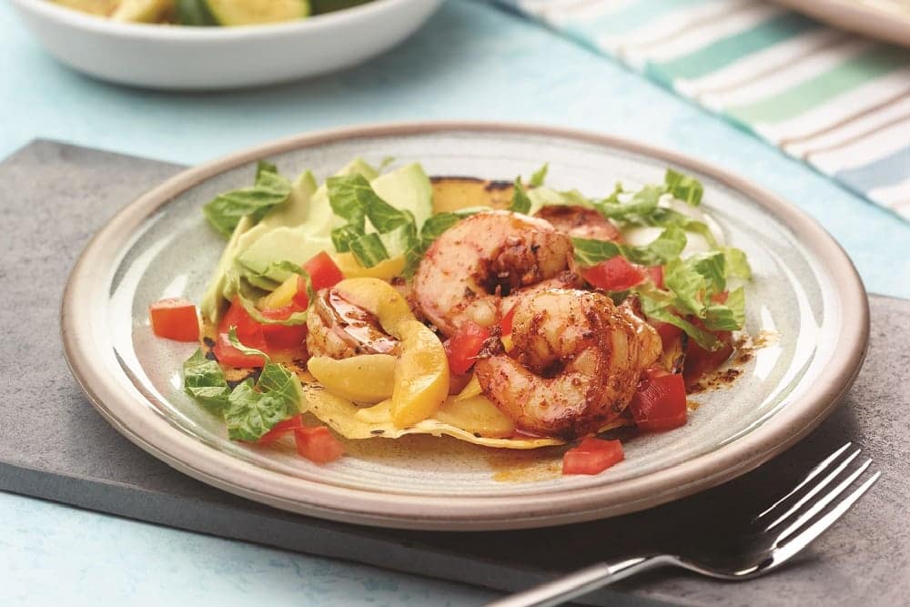 - To serve, add the shrimp to the tortilla and top with mango and avocado.