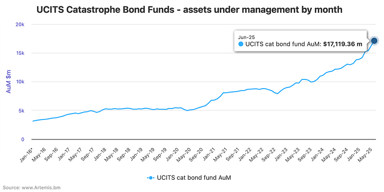 Catastrophe bond funds structured in the UCITS format continued to rapidly expand through the second-quarter of 2025, with the sector as a whole having grown its combined cat bond assets under management by an impressive 24%, or over $3.31 billion, just since the end of last year.