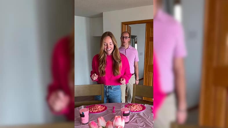 The influencer goes all out with the pink theme this time, opting for a tablecloth and utensils of the same colour. But the twist is her husband, who comes wearing pink socks and a rosy-hued T-shirt, indicating that he had caught on to her antics. The clip was captioned, “Took him long enough.” The video was shared on April 14 and has received over 700,000 likes.